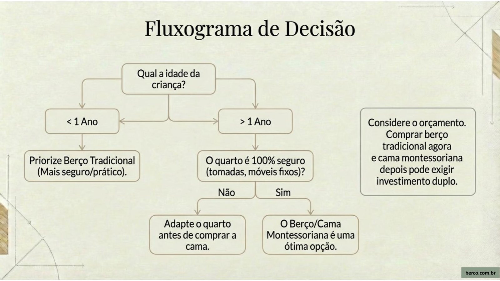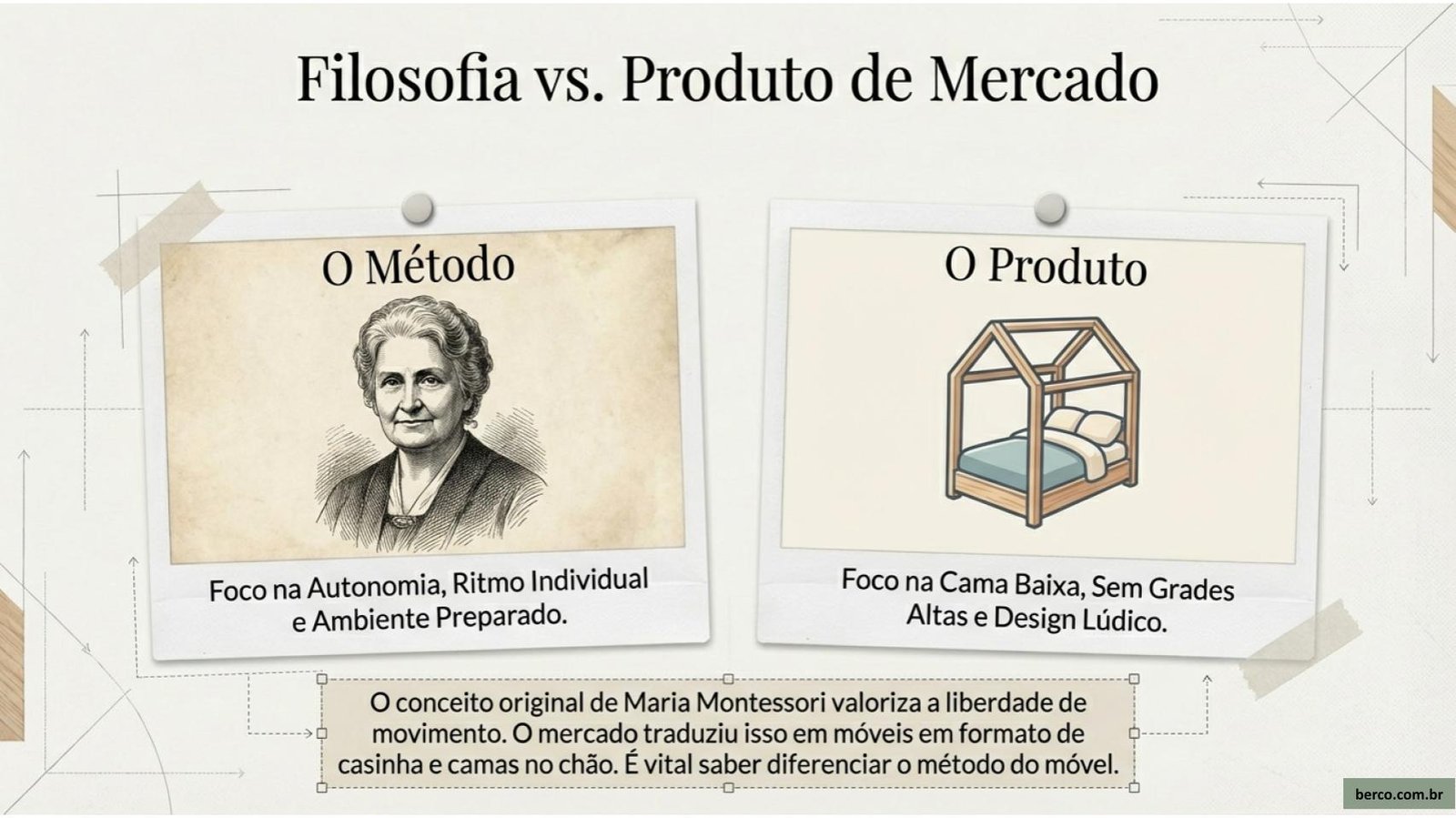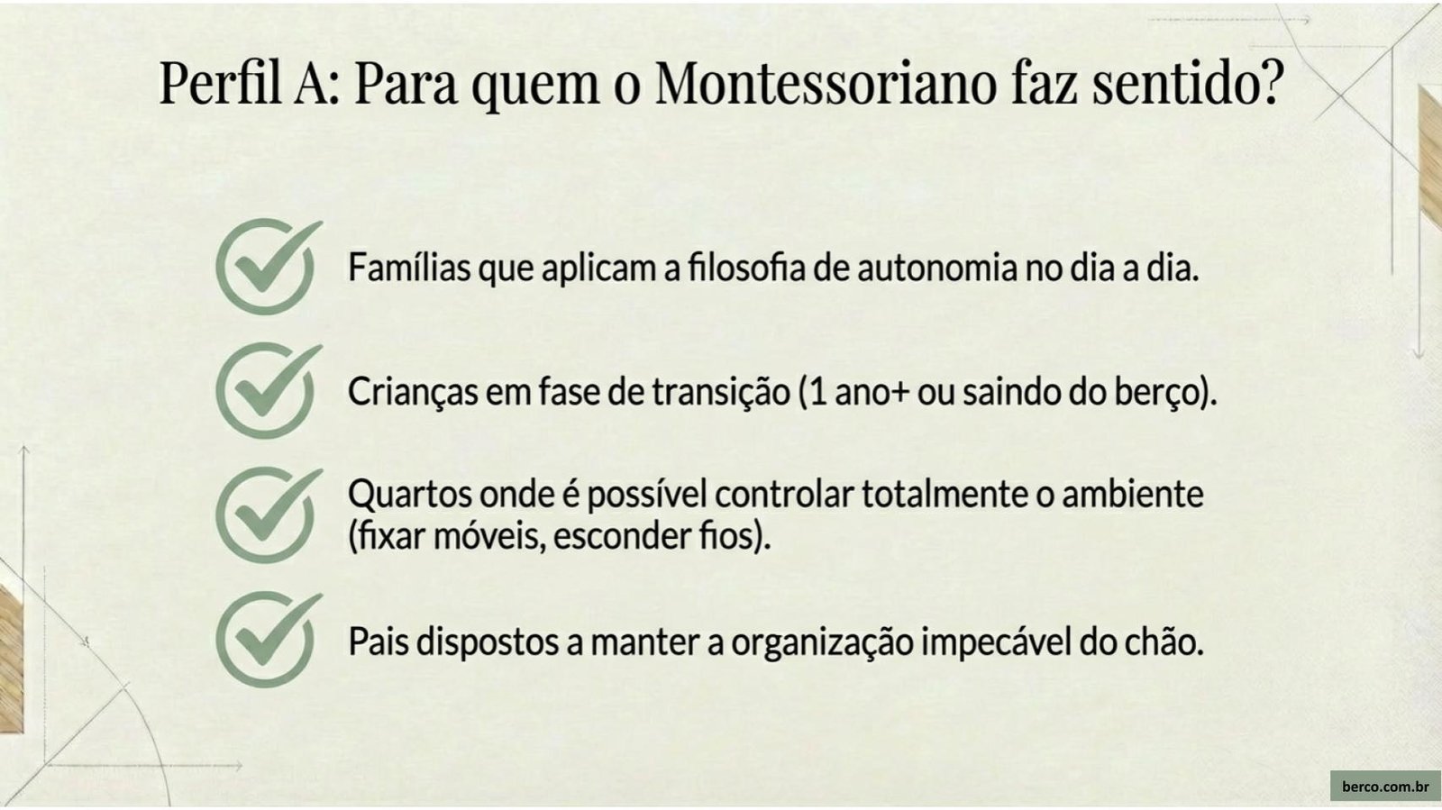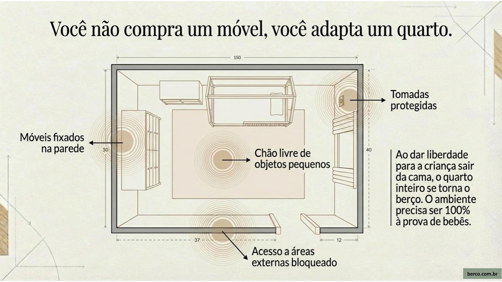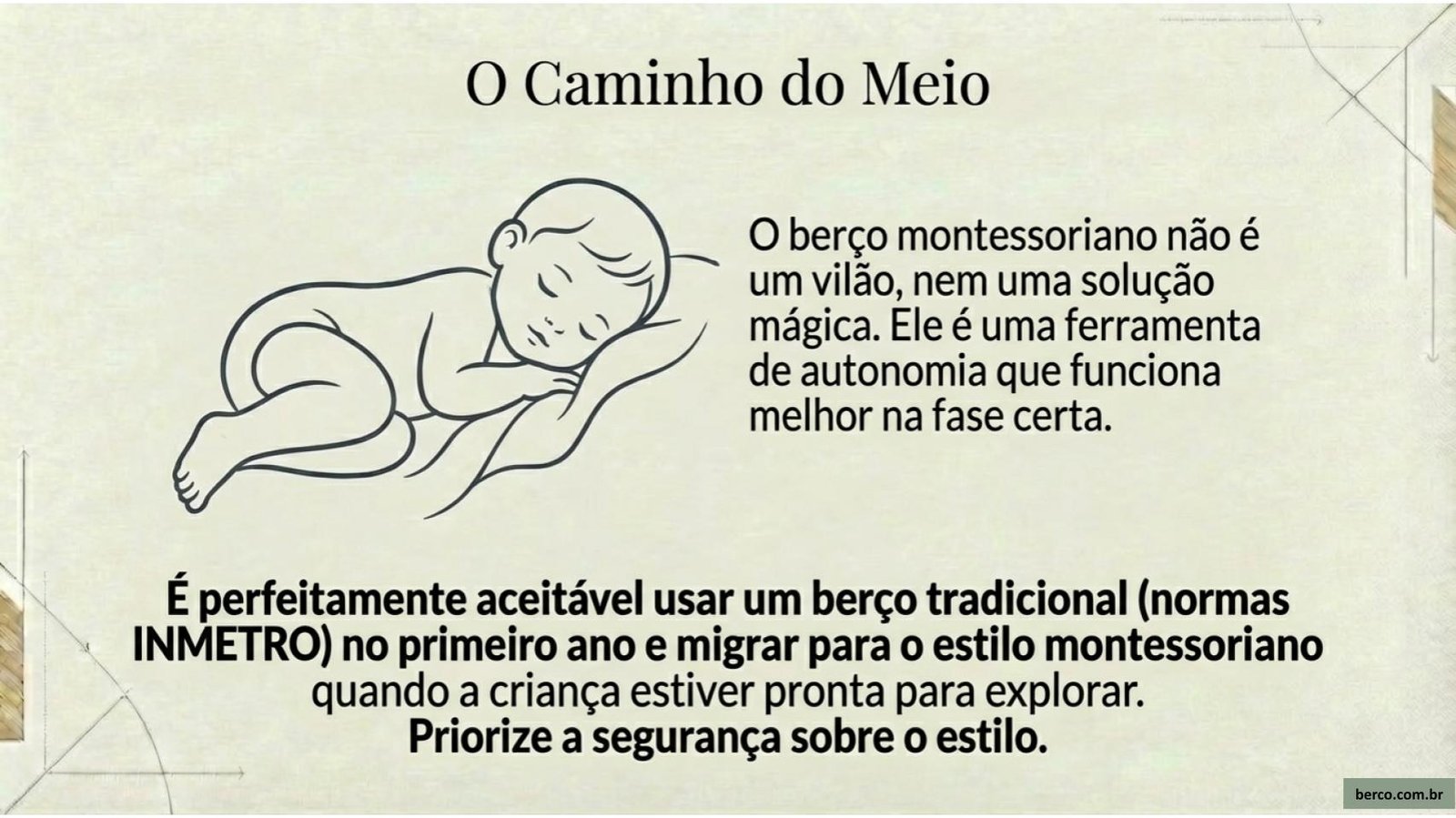 Ou seja: o berço montessoriano só faz sentido se vier junto com um ambiente inteiro adaptado, e não apenas com a cama baixa.
