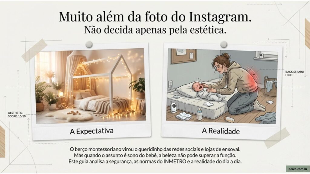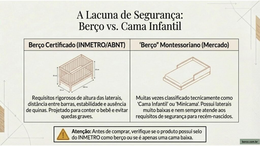 Na maior parte das vezes, esse tipo de móvel se encaixa mais na categoria “cama infantil montessoriana” do que na definição técnica de berço tradicional prevista nas normas brasileiras.