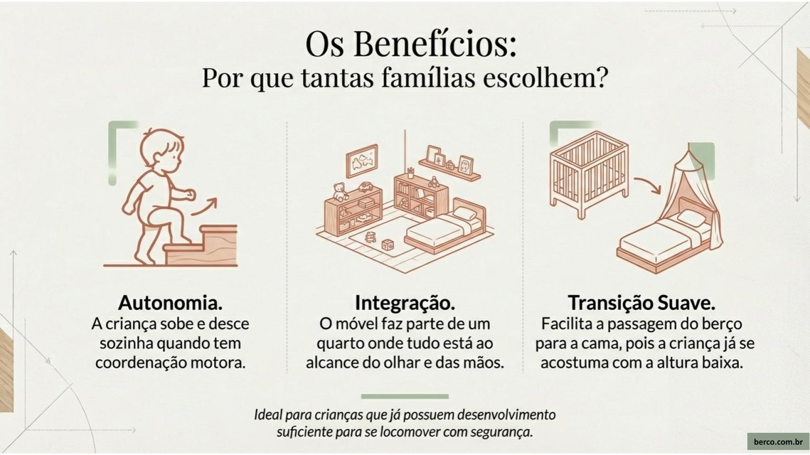Para algumas famílias, principalmente as que valorizam muito a abordagem Montessori e conseguem adaptar bem a casa, ele faz bastante sentido como etapa de transição para a cama.