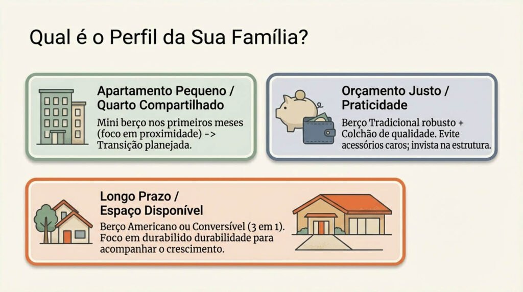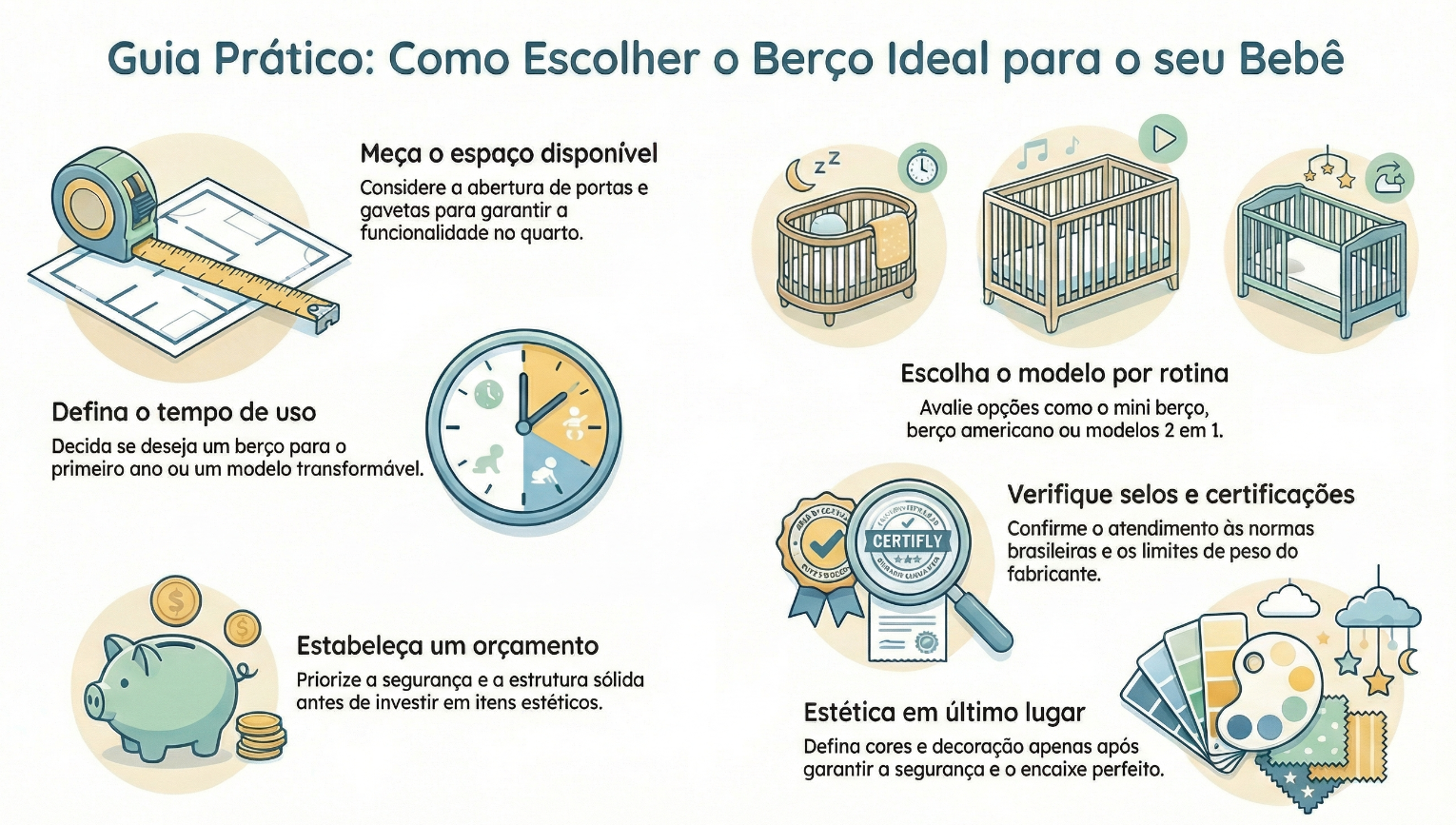 Ao responder essas perguntas, você filtra as opções e evita compras por impulso. Para aprofundar, veja o guia prático para escolher berço com exemplos reais.