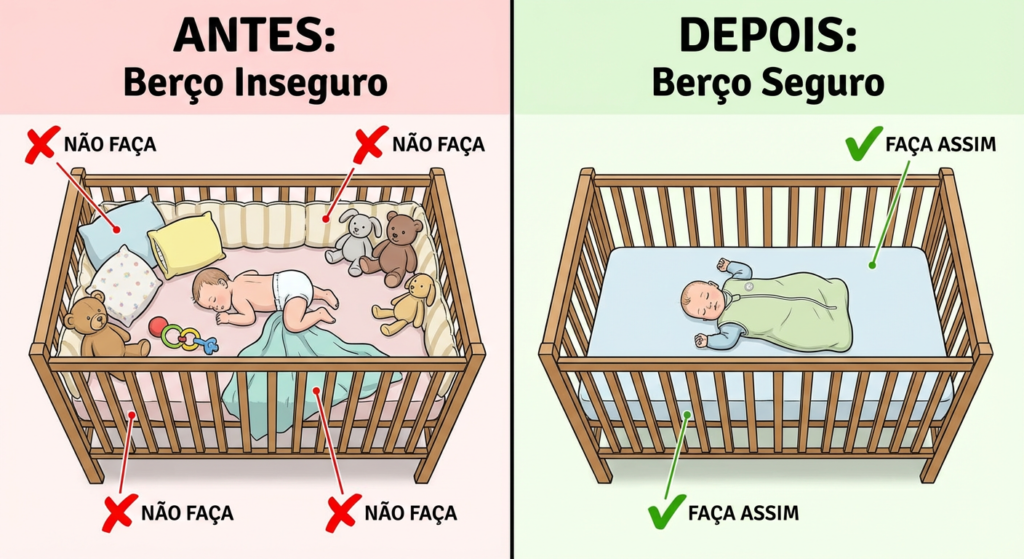 A imagem de antes/depois acima ajuda a visualizar um berço inseguro e um ambiente seguro para o sono do bebê.
