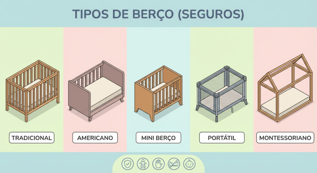A imagem acima ajuda a visualizar rapidamente as diferenças entre cada tipo. Para ver prós, contras e indicações detalhadas, acesse o guia completo de tipos de berço.