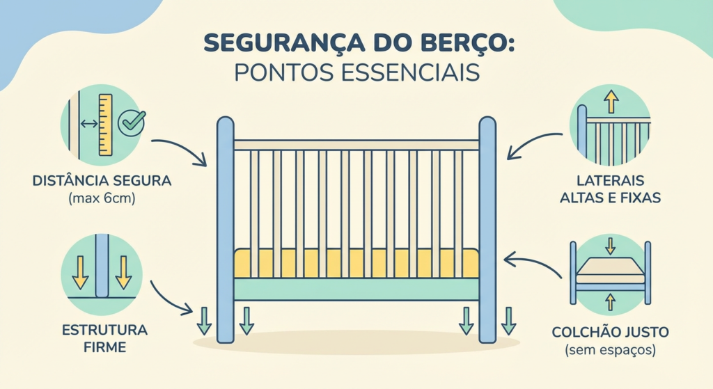 Procure sempre pelo selo do INMETRO e, se possível, confira o número do certificado antes da compra. Saiba mais detalhes sobre segurança de berços neste guia completo.
