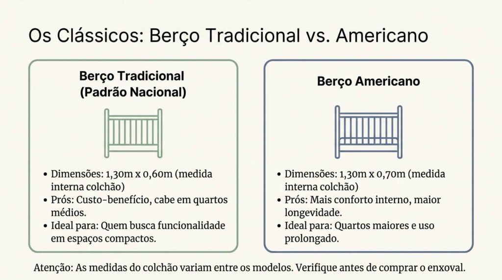 Berço americano: Padrão mais comum no Brasil, com medidas um pouco maiores e boa oferta de colchões e enxoval compatíveis.