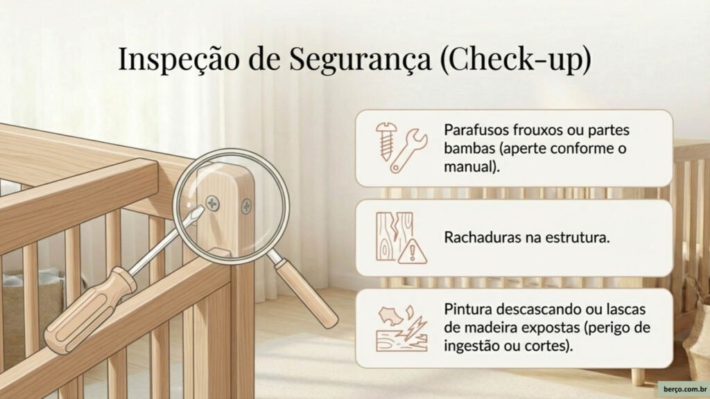 - Parafusos frouxos, partes bambas ou rachaduras na estrutura do berço.