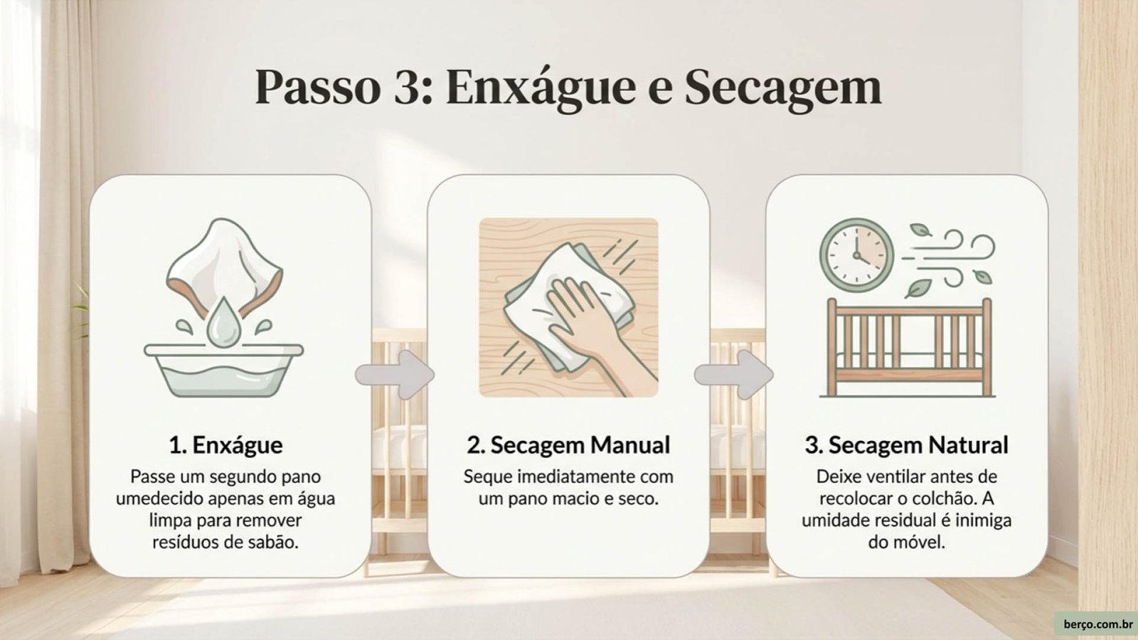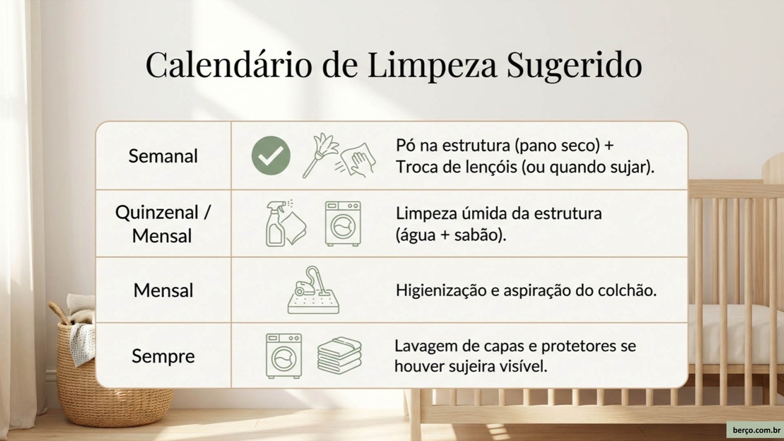 - Nunca deixe o bebê no berço enquanto você está limpando ou enquanto o berço ainda está úmido.