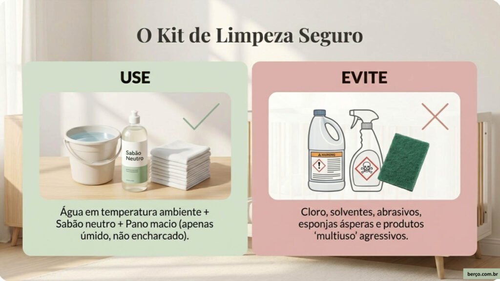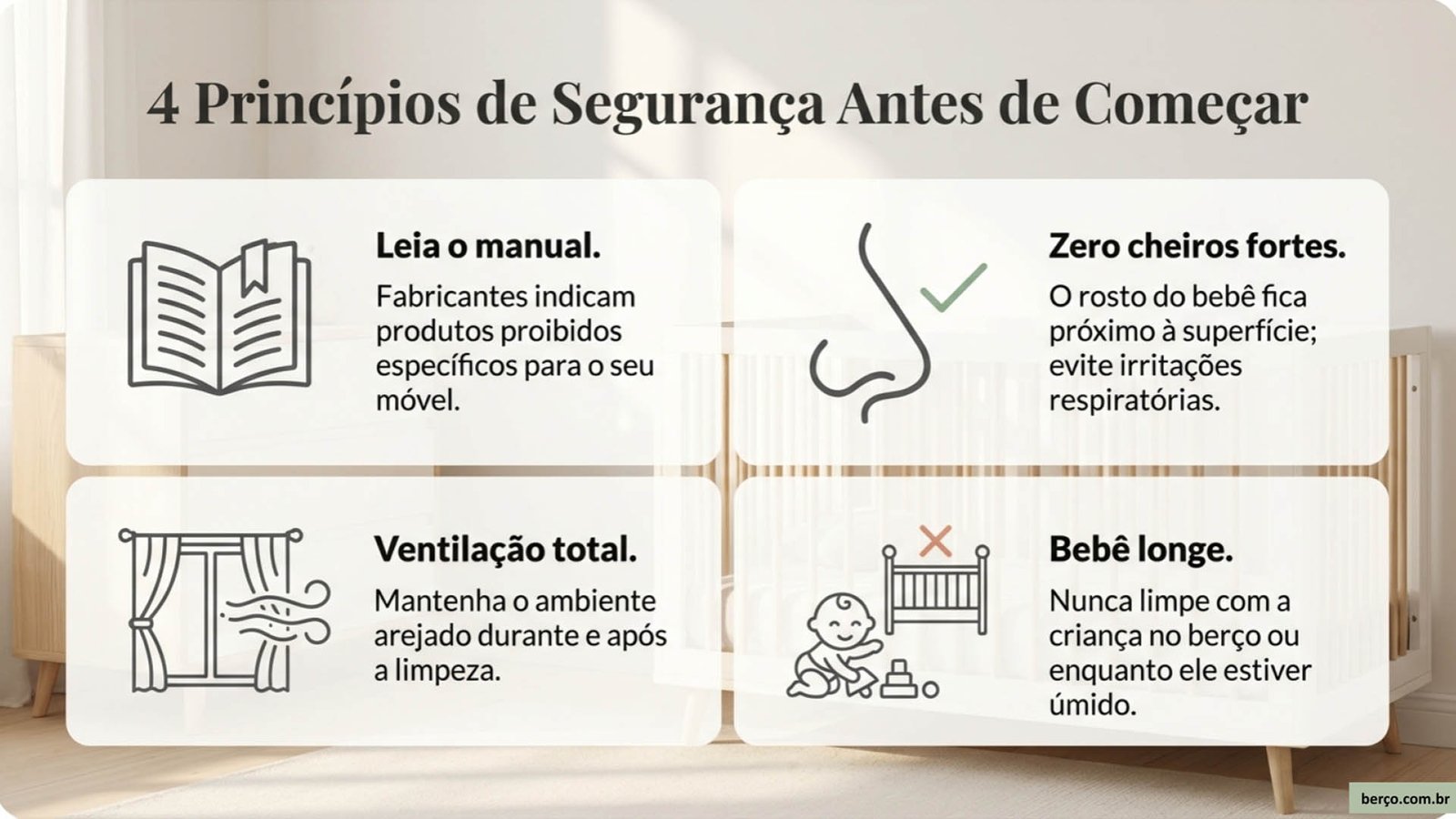- Evite produtos com cheiro muito forte, cloro, solventes ou abrasivos. O bebê fica com o rosto muito próximo às superfícies do berço.