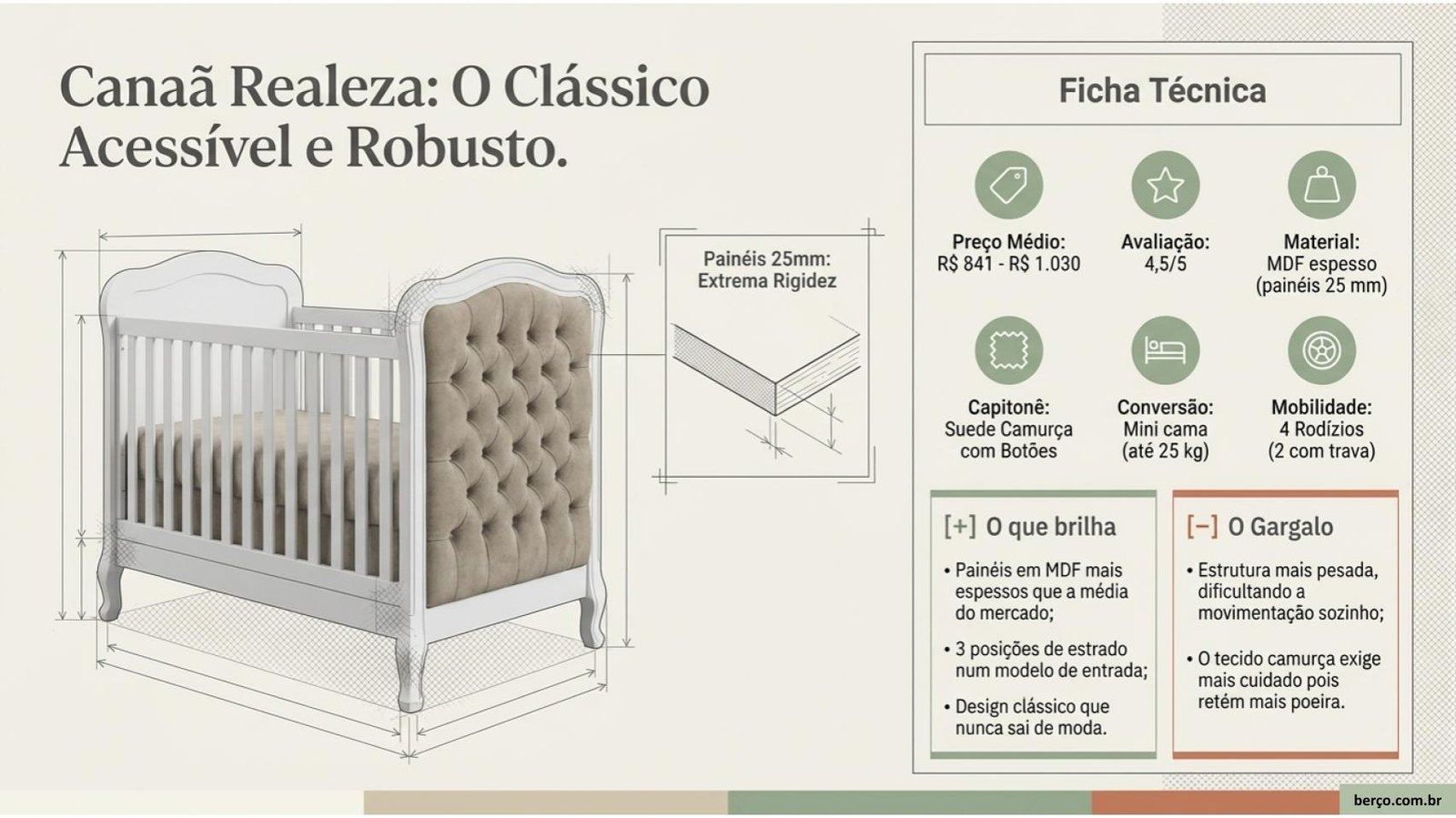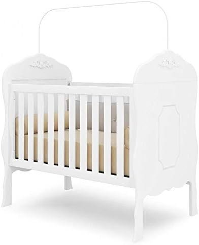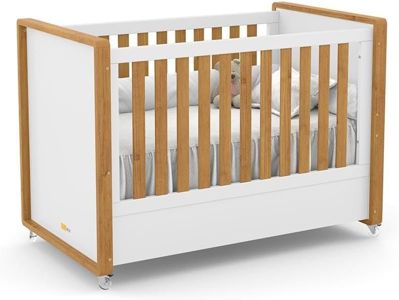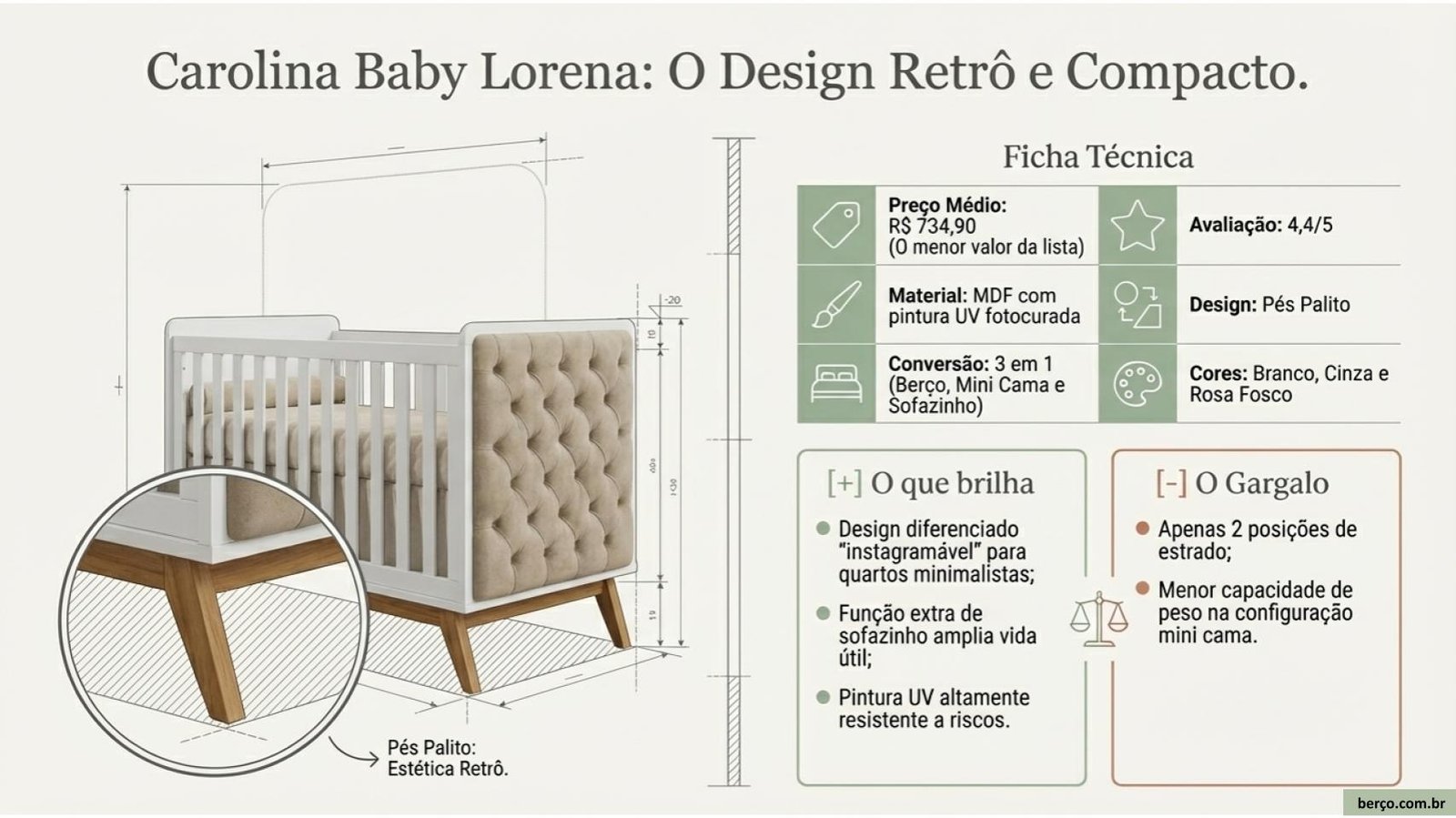O mais compacto e acessível da lista. O Lorena da Carolina Baby se destaca pelo design retrô com pés palito — um visual diferente dos modelos tradicionais que agrada muito em quartos com proposta mais moderna ou minimalista.