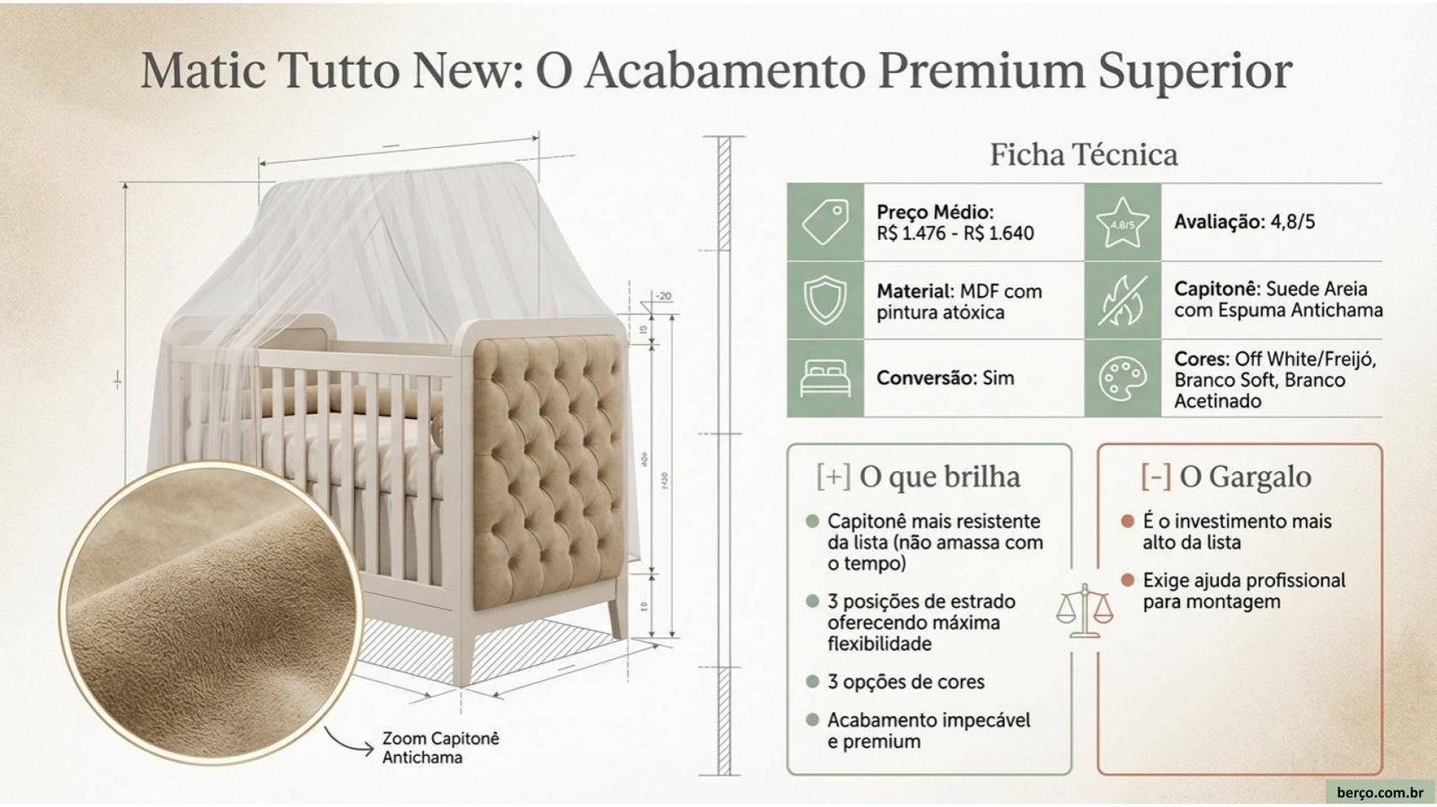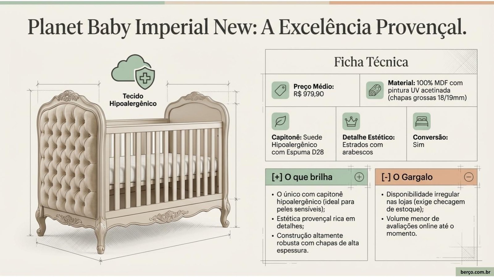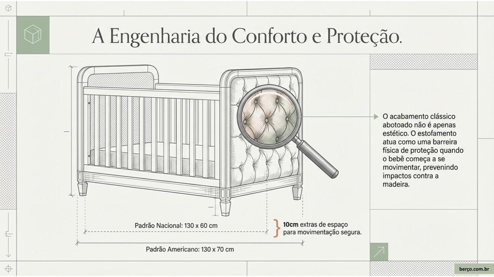 • Capitonê hipoalergênico — ideal para bebês com pele sensível