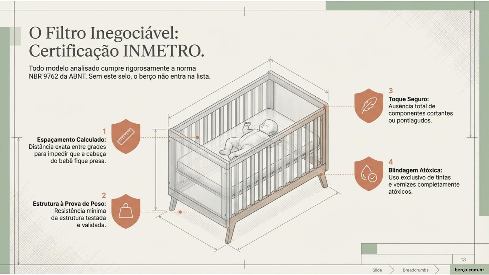 Todo berço vendido no Brasil precisa seguir a NBR 9762 da ABNT e ter o certificado INMETRO. Essa norma define: