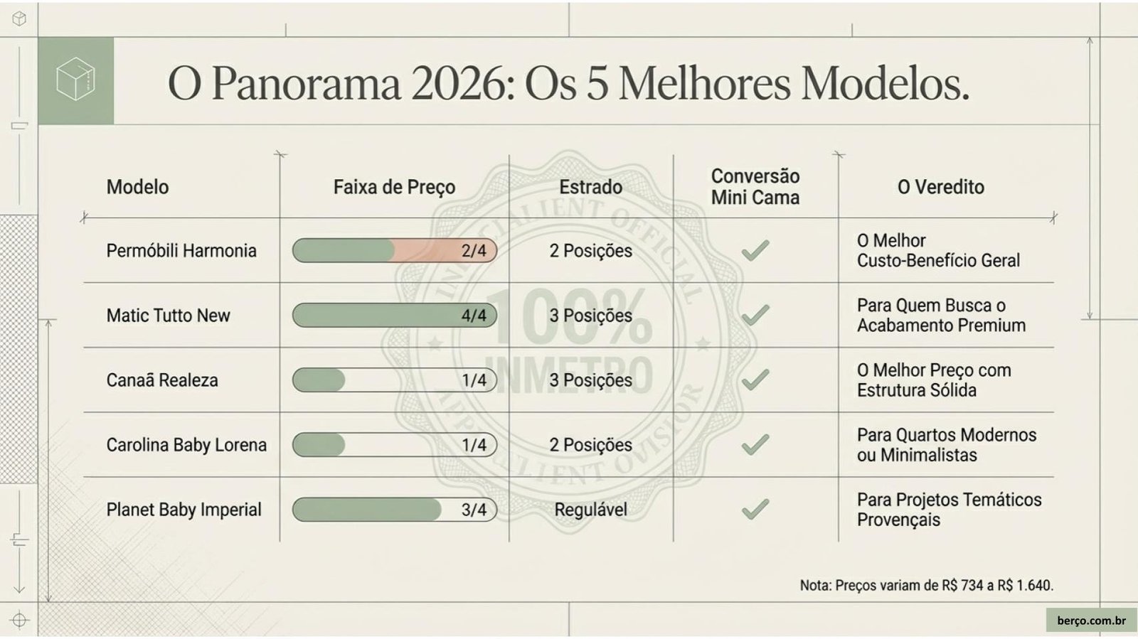 Modelo Preço médio INMETRO Posições estrado Mini cama Melhor para