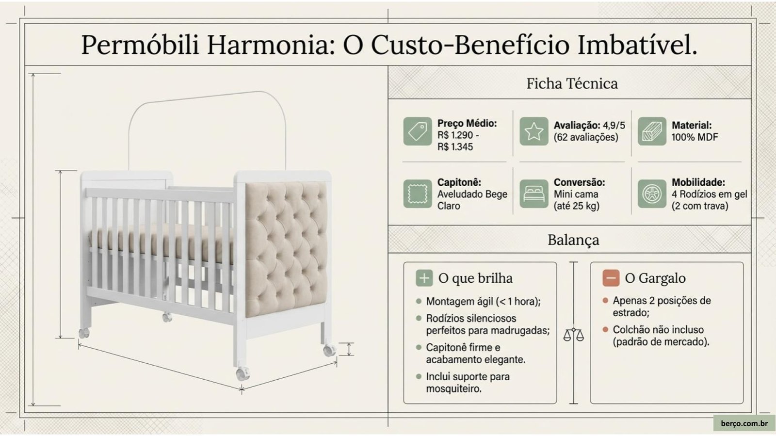 O Permóbili Harmonia é o berço com a melhor relação entre preço, qualidade e avaliações reais nesta lista. Com 62 avaliações e média 4,9 no Mercado Livre, ele se destaca como a escolha mais segura para quem não quer arriscar.